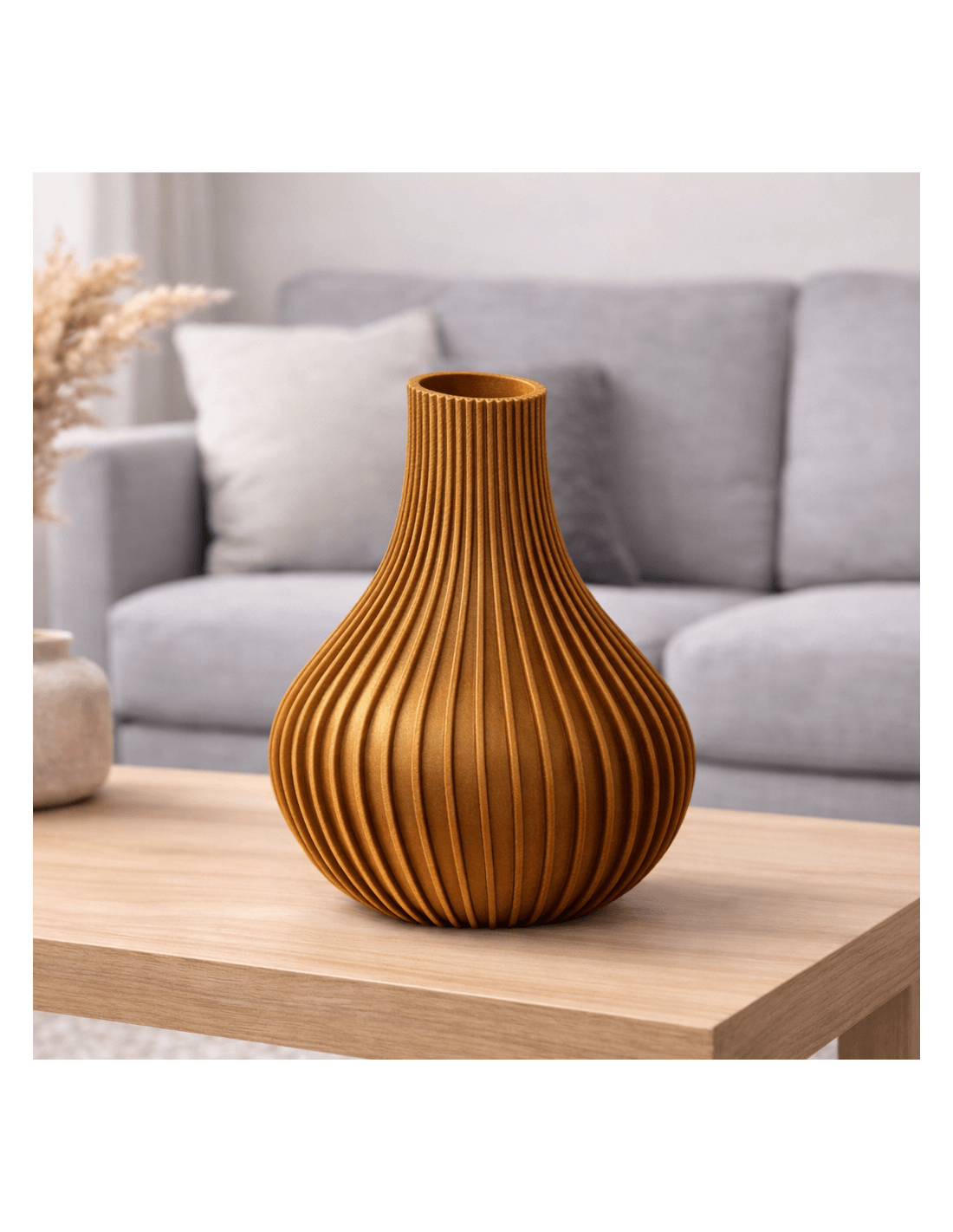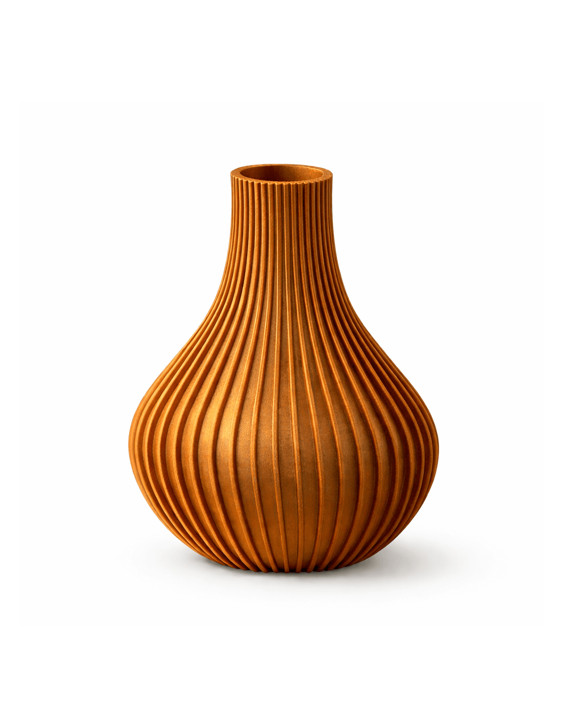 Lichtgewicht 3D-geprinte vaas met stijlvolle ribbelstructuur en brons-look afwerking. Een modern decoratief object voor elk interieur.