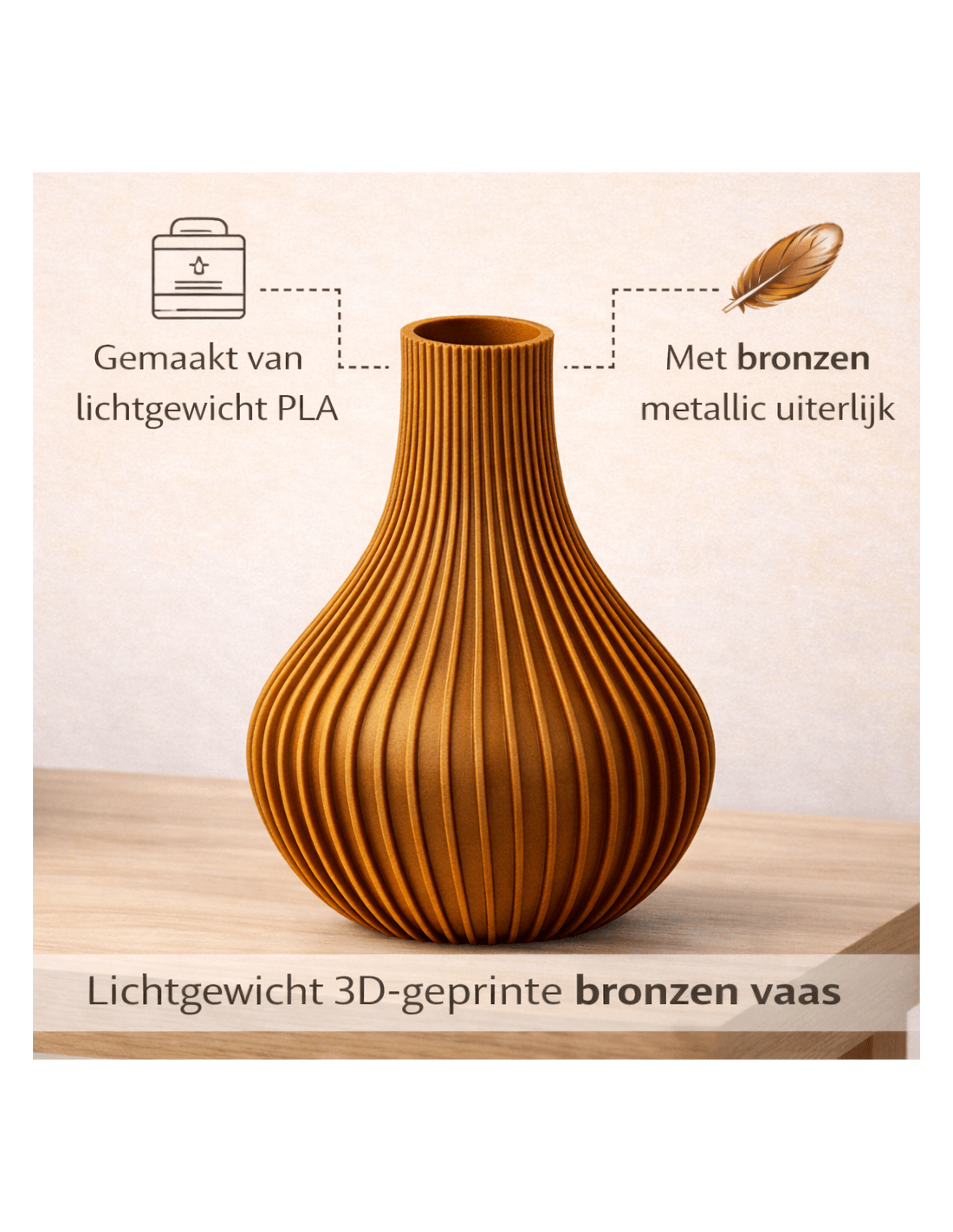 Deze brons-look vaas combineert een luxe uitstraling met een modern ontwerp. De vaas is 3D-geprint van lichtgewicht PLA en afgewerkt met een warme, metallic brons-look. De verticale ribbelstructuur geeft diepte en karakter, waardoor de vaas direct in het oog springt.