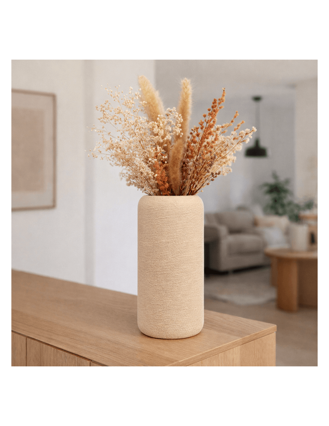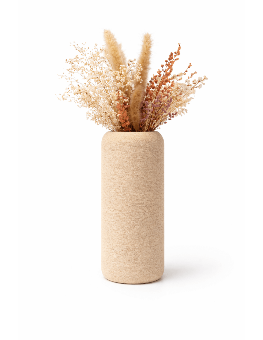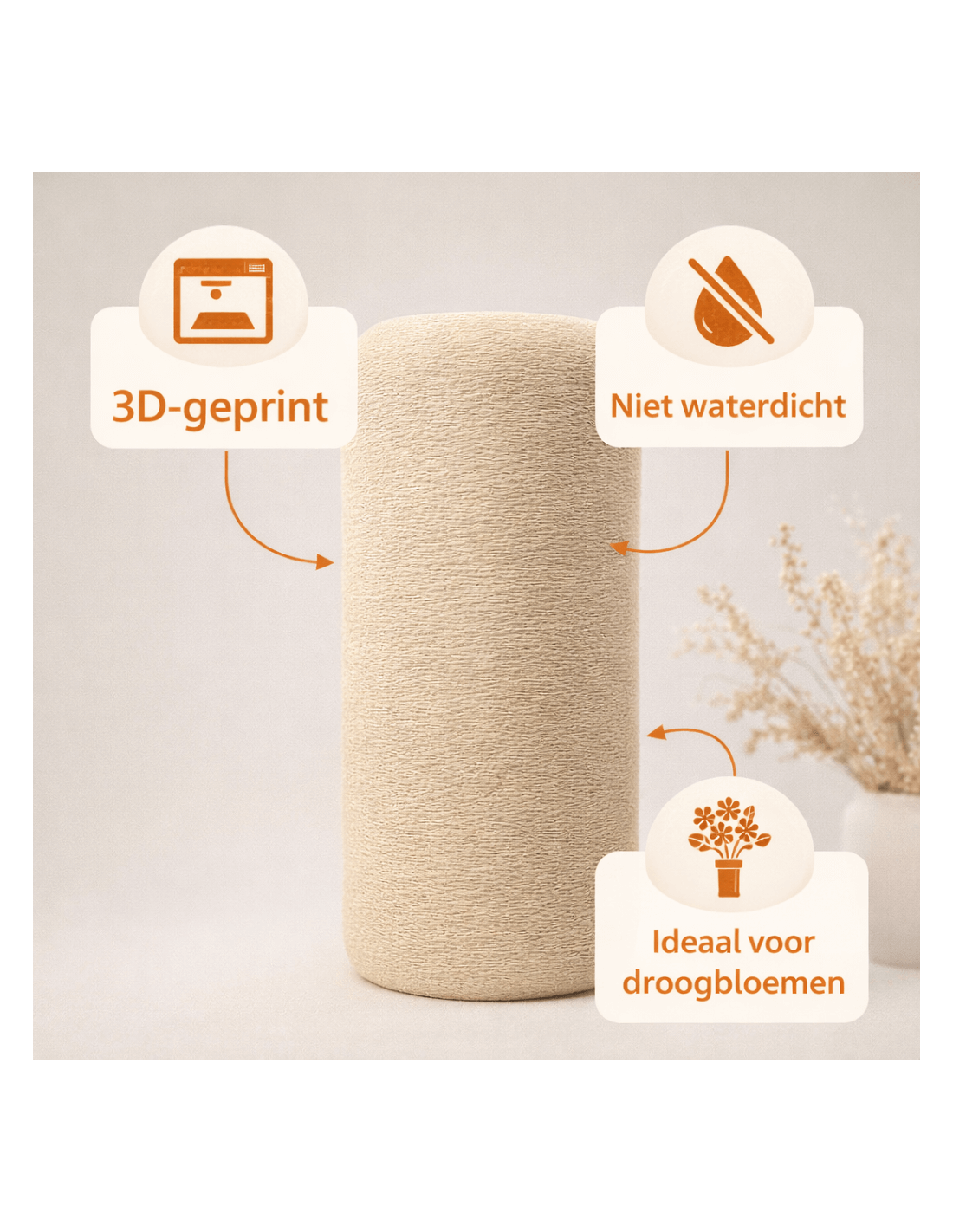 Strakke 3D-geprinte cilindervaas met natuurlijke textuur. Lichtgewicht, niet waterdicht en ideaal voor droogbloemen in een modern interieur.
