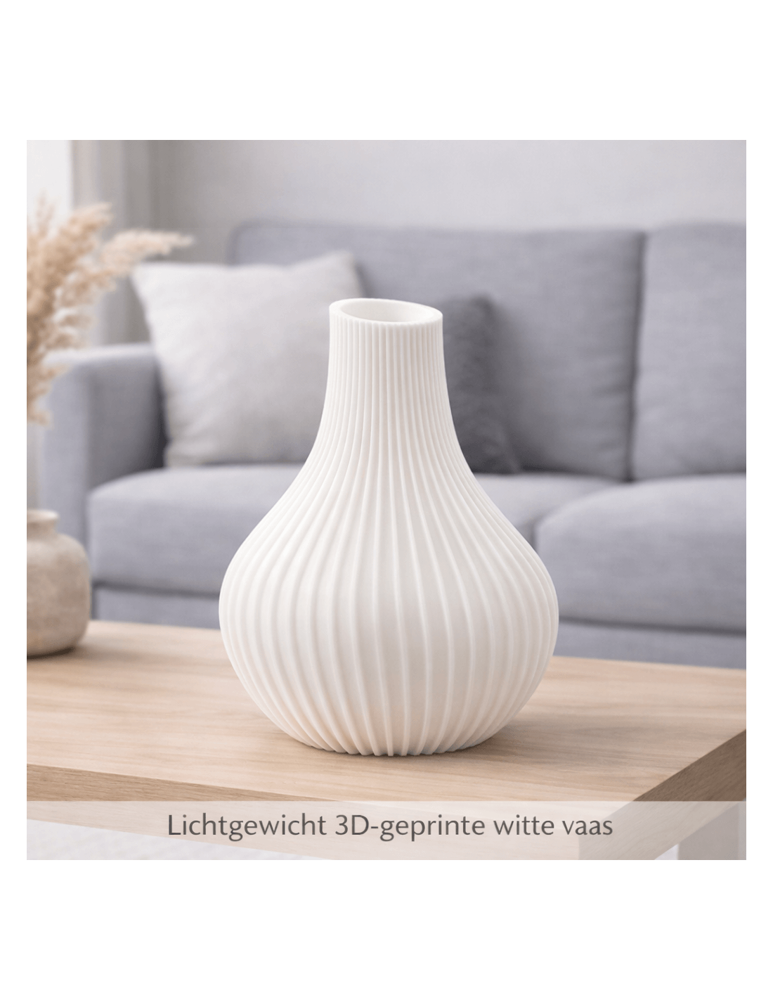 Lichtgewicht witte 3D-geprinte vaas met elegante ribbelstructuur. Een moderne en stijlvolle toevoeging aan elk interieur.