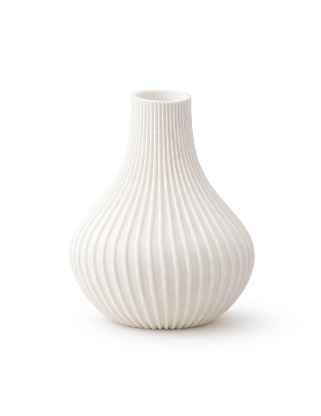 Deze witte designvaas combineert eenvoud met verfijning. De vaas is 3D-geprint van lichtgewicht PLA en heeft een strakke geribbelde textuur die zorgt voor een moderne, rustige uitstraling.