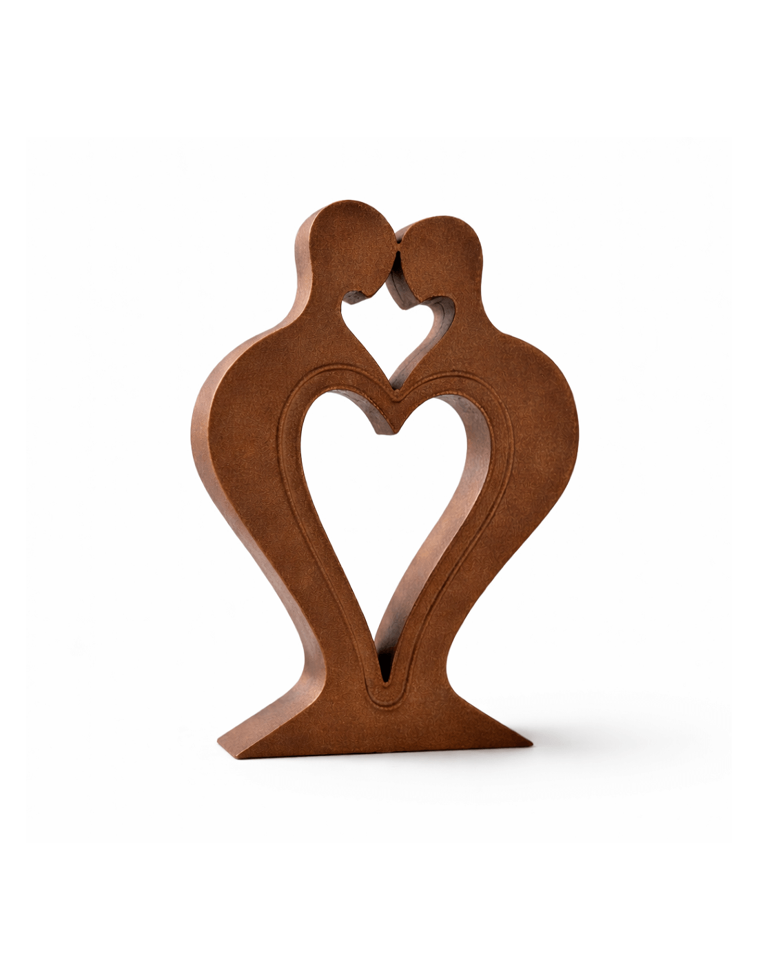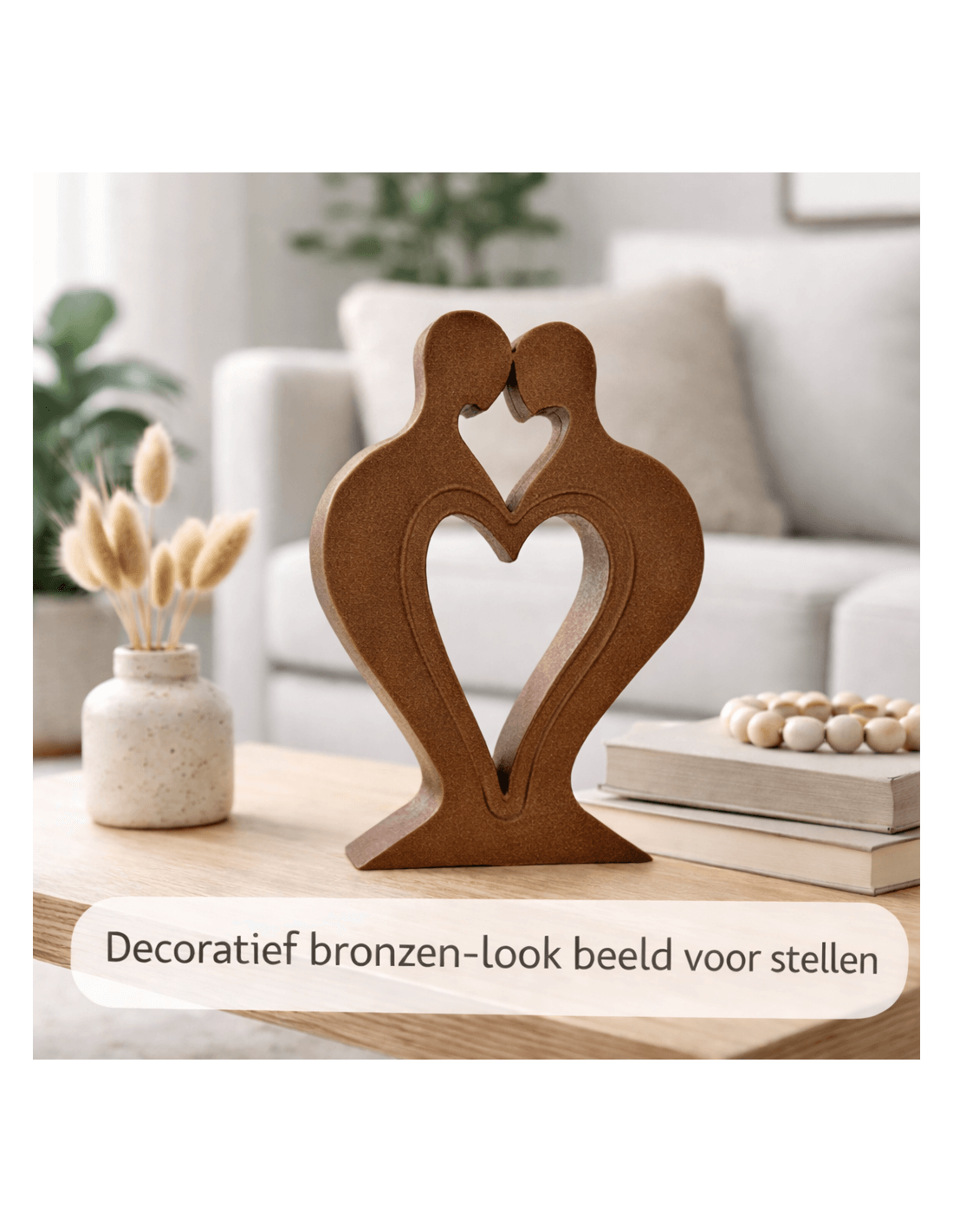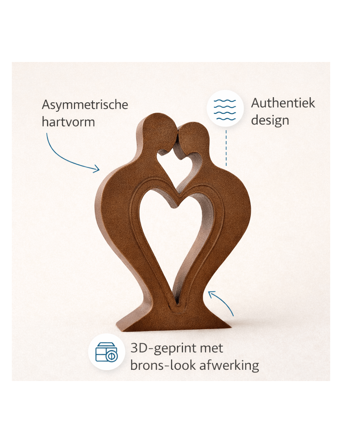 Dit decoratieve hartbeeld staat symbool voor verbinding en liefde. Het ontwerp toont twee abstracte figuren die samen een asymmetrische hartvorm vormen. De warme brons-look afwerking geeft het beeld een luxe en authentieke uitstraling.