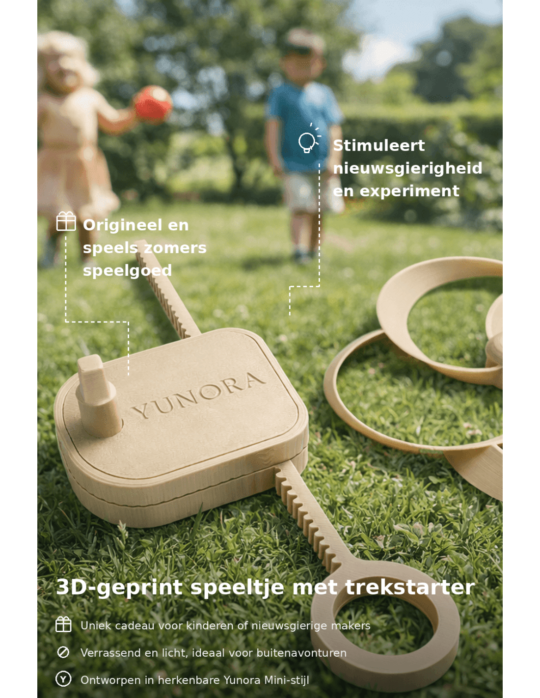 Binnen de wereld van Yunora Mini draait alles om ontdekken, bouwen en onderzoeken. Deze propeller past daar perfect in: een toegankelijke mini-creatie die kinderen uitnodigt om te proberen, te herhalen en nieuwsgierig te blijven, terwijl ook volwassenen er plezier in vinden als origineel designobject of speelse gadget.